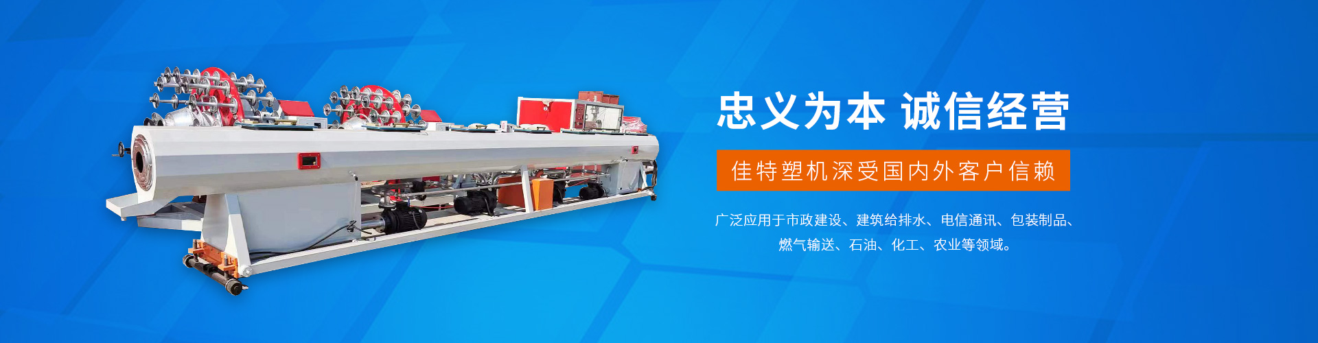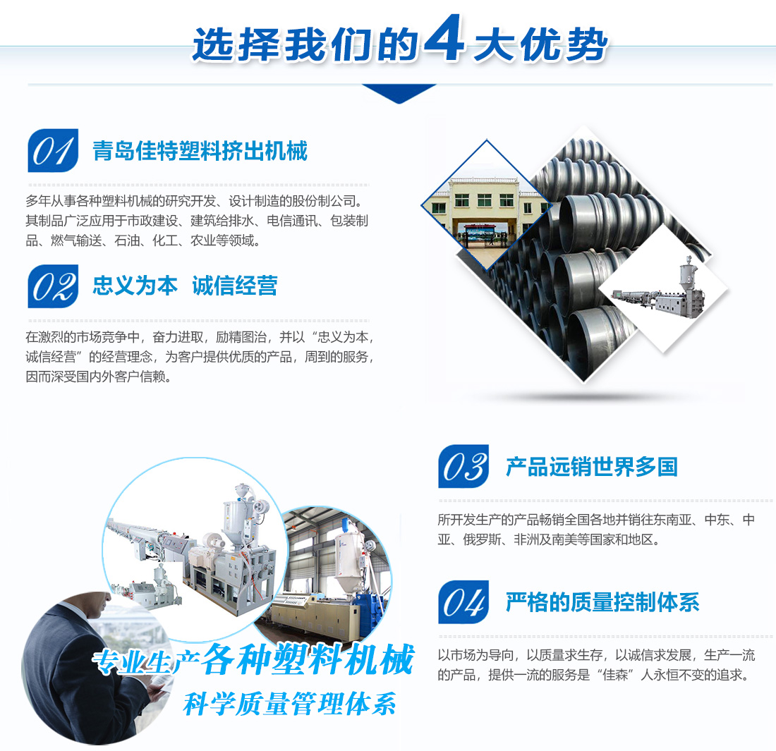 青島佳特塑料擠出機械有限公司是多年從事各種塑料機械的研究開發、設計制造的股份制公司。公司主導產品:PP、PE鈣塑格子板生產線,大口徑雙重壁纏繞管生產線,U-PVC、C-PVC管材生產線,PP、PE、PPR、PPB供水燃氣管材生產線、硅芯管生產線、鋁塑、鋼塑、銅塑管、尼龍棒、尼龍管生產線,PVC、PE、PP波紋管生產線,單雙向土工格柵生產線,木塑板材生產線,PVC、PP、PE片材、板材生產線,PET打包帶生產線,其制品廣泛應用于市政建設、建筑給排水、電信通訊、包裝制品、燃氣輸送、石油、化工、農業等領域。 [查看更多]
